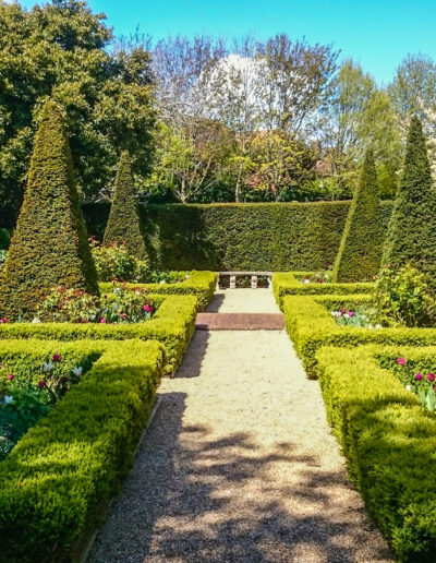 With twelve foot high yew pyramids set in box parterres, this front garden is quite dramatic, which gives a great sense of drama to this well known English actors’ Georgian Home. A simple brick path leads up to the front door and fine gravel pathways lead you round the rest of the garden. This garden is all about scale and form. I am continuing working in this garden to update the planting at the rear of the property.